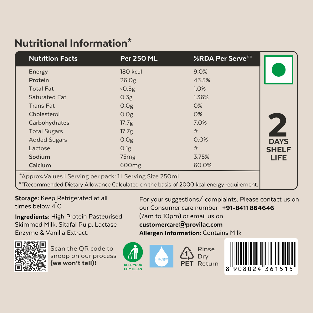 Completely lactose-free, it’s gentle on the stomach and suitable even for those with lactose sensitivity. Provilac High Protein Sitafal Milk delivers serious protein with the goodness of real fruit pulp and the wholesome benefits of milk.