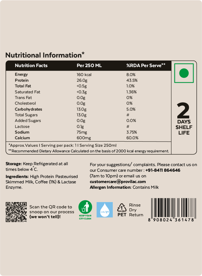 Provilac's High Protein Coffee is where clean strength meets bold indulgence. Each 250 ml bottle delivers 26g of naturally derived protein and just 152 calories, blended with premium coffee for a kick that's as real as it gets. This is not instant flavoring it is authentic coffee, rich in caffeine and antioxidant polyphenols known to heighten alertness, sharpen focus, and fuel endurance. The roasted depth of coffee pairs with high-quality dairy protein to support muscle recovery, curb cravings, and provide steady energy. With a light, fat-free body and lactose-free formulation, it is refreshingly easy on the stomach fuel without the heaviness, strength without the discomfort. For athletes, hustlers, and anyone who demands more from their daily brew, this is not just another protein shake it is 250ml of clean fuel and coffee's timeless fire in a bottle.